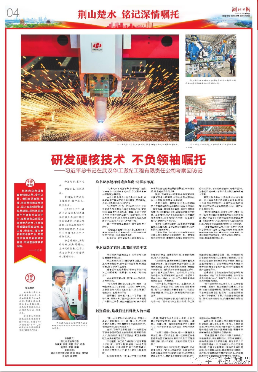 6月28日,習(xí)近平總書記在湖北省委書記王蒙徽、省長(zhǎng)王忠林陪同下,來(lái)到華工科技子公司武漢華工激光工程有限公司考察,在公司全體員工中引發(fā)熱烈反響,大家紛紛表示:“將深入踐行習(xí)近平總書記考察時(shí)的重要講話精神,踔厲奮發(fā),為實(shí)現(xiàn)科技自立自強(qiáng)貢獻(xiàn)力量”。人民日?qǐng)?bào)、央視新聞聯(lián)播、央視新聞、湖北日?qǐng)?bào)、湖北電視臺(tái)、長(zhǎng)江日?qǐng)?bào)等多家主流媒體對(duì)華工科技展開回訪,并進(jìn)行了全方位、多視角報(bào)道。