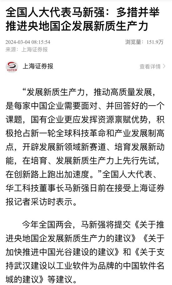 3月4日至11日,全國(guó)兩會(huì)在北京召開(kāi)。十四屆全國(guó)人大二次會(huì)議期間,全國(guó)人大代表,華工科技黨委書記、董事長(zhǎng)馬新強(qiáng)提交了《關(guān)于加快推進(jìn)中國(guó)(武漢)光谷建設(shè)的建議》、《關(guān)于推進(jìn)央國(guó)企發(fā)展新質(zhì)生產(chǎn)力的建議》、《關(guān)于支持武漢建設(shè)以工業(yè)軟件為品牌的中國(guó)軟件名城的建議》等三項(xiàng)建議,涉及區(qū)域創(chuàng)新、新質(zhì)生產(chǎn)力等領(lǐng)域。